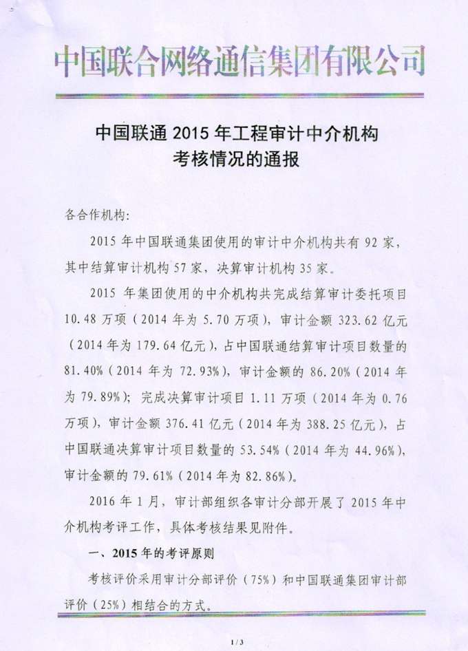 關于中國聯通2015年工程審計中介機構考核情況的通報