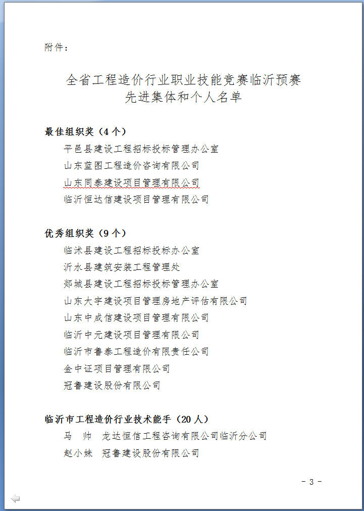在省住房和城鄉建設廳組織的全省工程造價行業職業技能競賽預賽中,山東同泰建設項目管理有限公司獲得最佳組織獎。