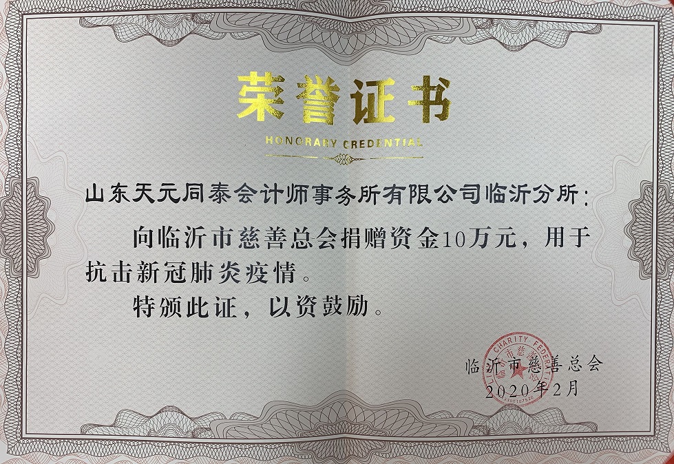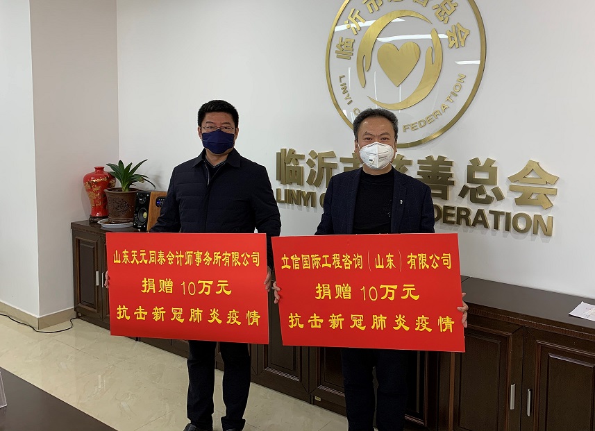 防控疫情,人人有責。在抗擊新冠肺炎關鍵時期,全體同泰人與全國人民同呼吸、共命運,特向臨沂市慈善總會捐款專項用于防控新冠肺炎,以表達同泰人疫情面前共擔當的決心和信心。其中山東天元同泰會計師事務所臨沂分所捐款10萬元,立信國際工程咨詢(山東)有限公司捐款10萬元,合計20萬元整。