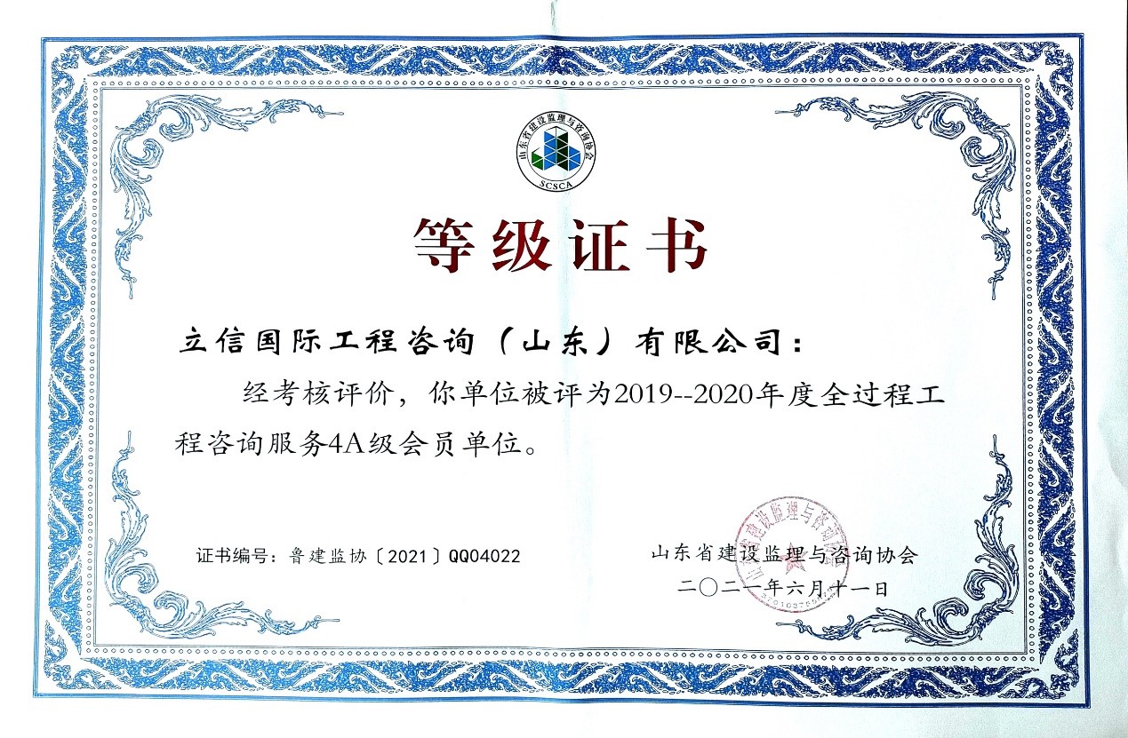 在山東省建設監理與咨詢協會開展的2019-2020年度全過程咨詢服務業務會員單位考核評價工作中,我公司被評選為山東省首批5A級會員監理企業、5A級會員招標代理機構、4A級全過程工程咨詢服務會員單位。