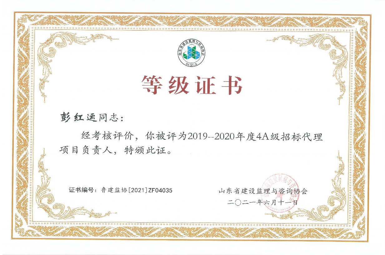 我公司員工多人被山東省建設監理與咨詢協會評選為2019-2020年度先進,其中,馬海嘯、張傳增被評為5A級總監理工程師,高宏、張傳增被評為5A級招標代理項目負責人,呂建建、彭紅運被評為4A級招標代理項目負責人。